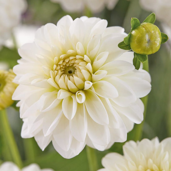 Aus der Familie der Anemonen-Dahlien. Die Pflanzen werden nicht besonders groß, dafür sind die Blüten absolut einzigartig. Eine zart cremegelbe, gefüllte Mitte mit schön runden, weißen Blütenblättern. Dank der sanften Farbkombination passt sie wunderbar zu Hochzeiten.